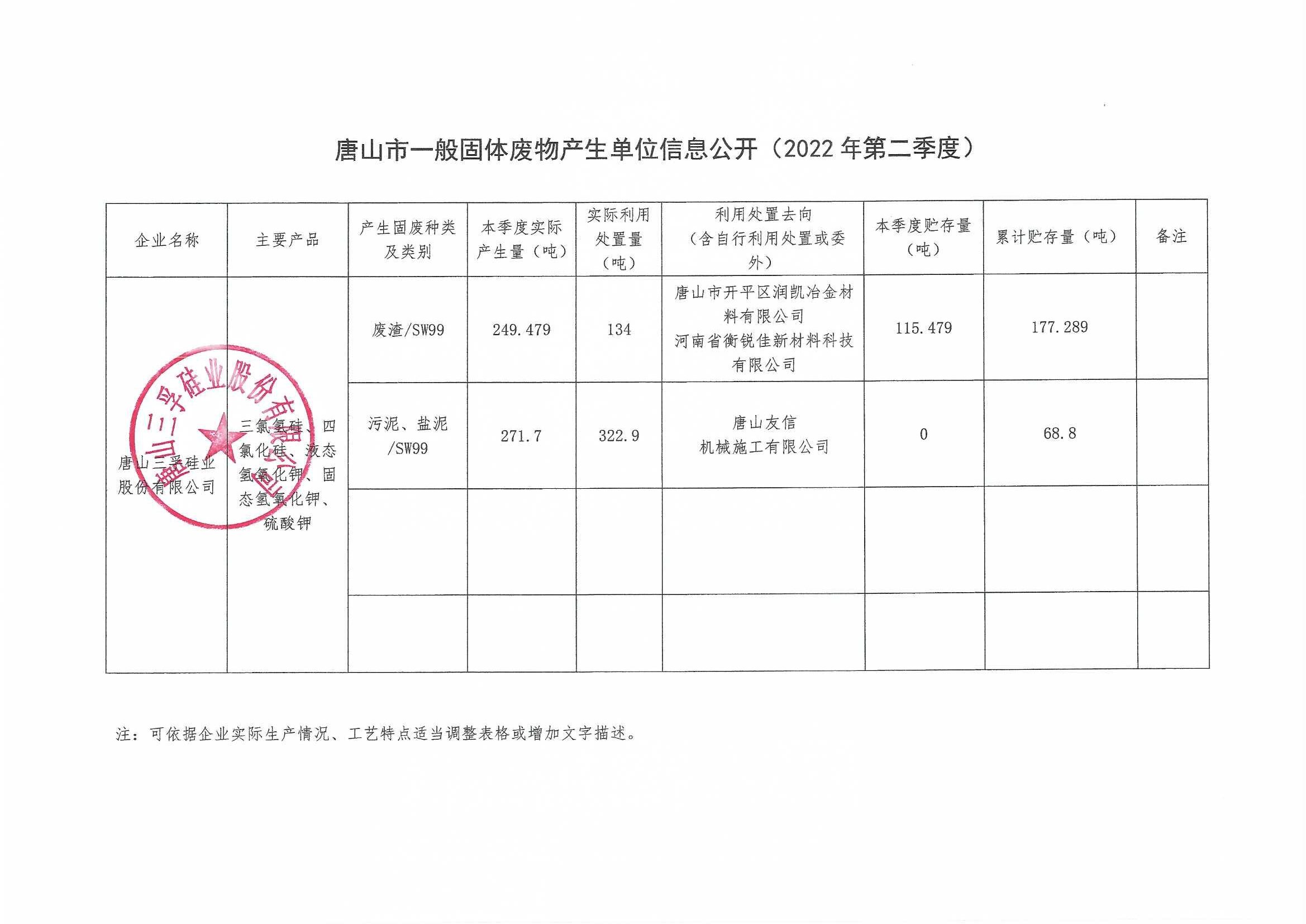 唐山三孚硅業(yè)股份有限公司2022年二季度一般固體廢物廢物信息公開(kāi)
