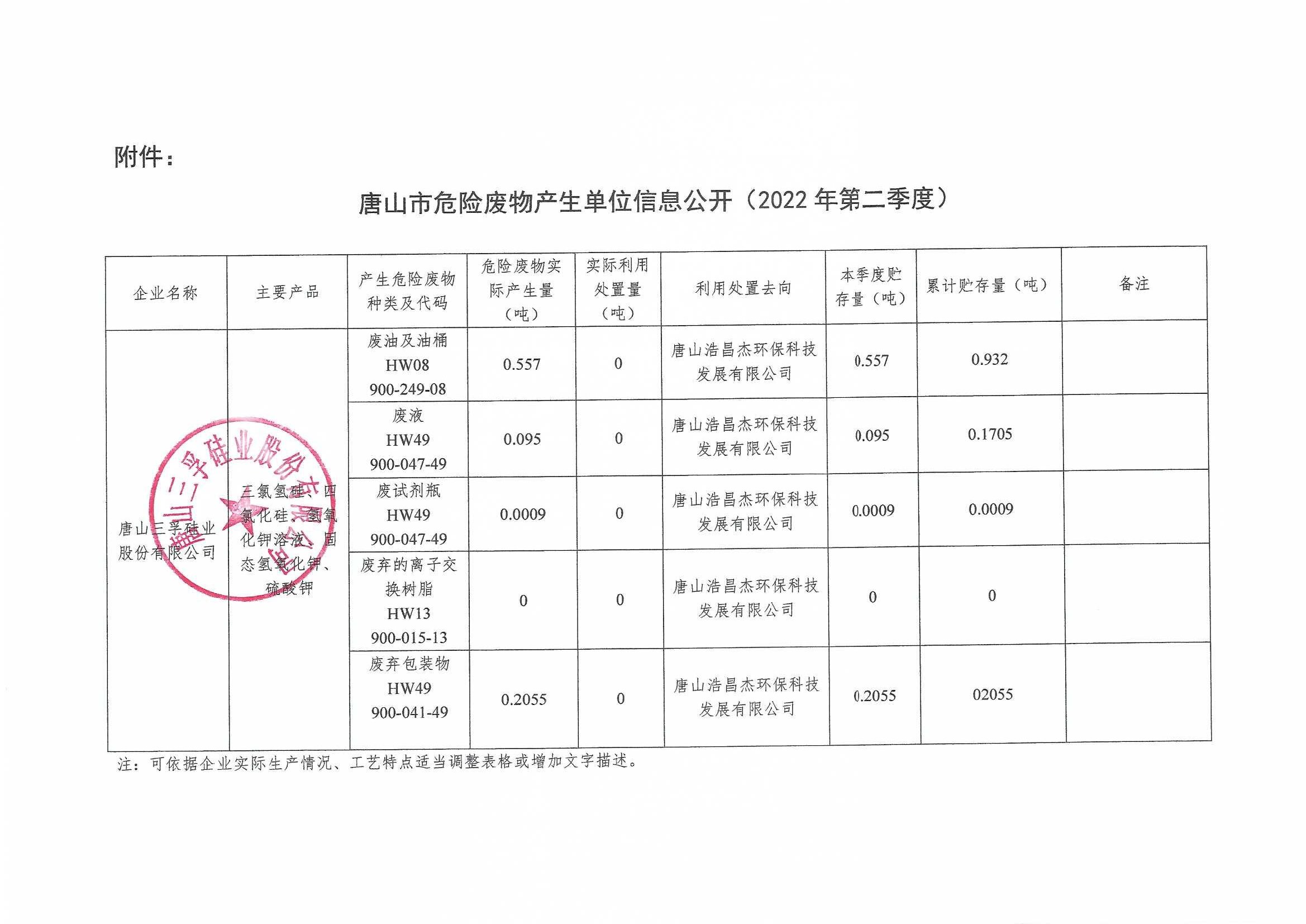 唐山三孚硅業(yè)股份有限公司2022年二季度危險(xiǎn)廢物信息公開