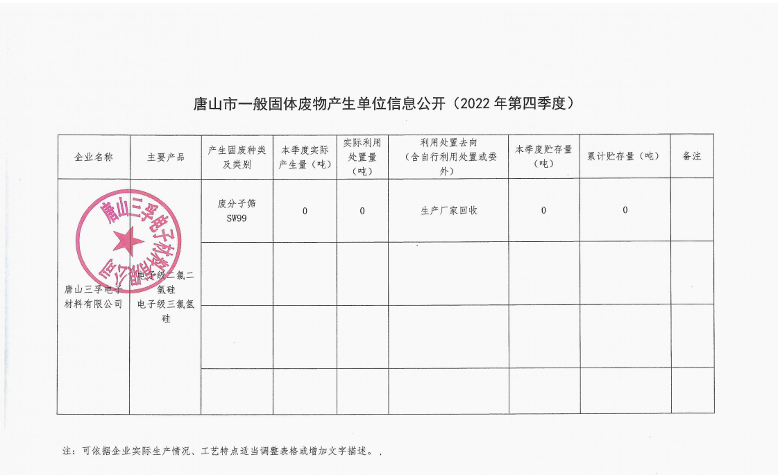 唐山三孚電子材料有限公司2022年第四季度一般固體廢物信息公開(kāi)
