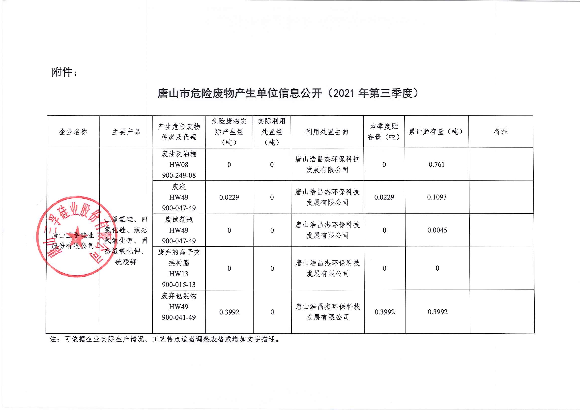 唐山三孚硅業(yè)股份有限公司 危險(xiǎn)廢物 三季度信息公開